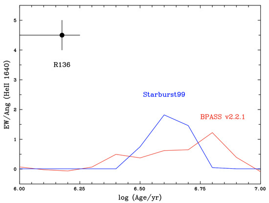 Comparison between observed He ii 1640 emission equivalent widths in R136 [5] versus predicted emission from BPASS (v.2.2.1, red) and Starburst99 (blue) population synthesis models (absorption lines are shown as negative values).