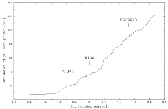 Cumulative ionizing output (10 ph/s) from spectroscopically classified early-type stars in the Tarantula, obtained from VFTS [50,51,53], VLT/MUSE [11], HST/STIS [55] and literature results [56], updated from [12]. Specific regions within 30 Dor are indicated from Table 1.