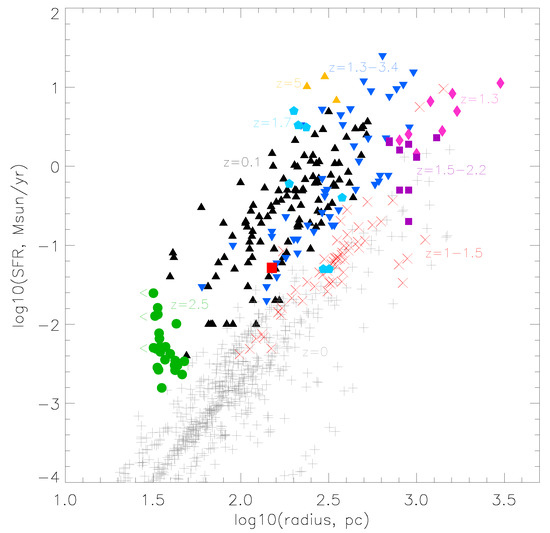 Comparison between the integrated star-formation rate versus size of the Tarantula (filled red square) and star-forming knots from galaxies spanning a range of redshifts, adapted from [106].