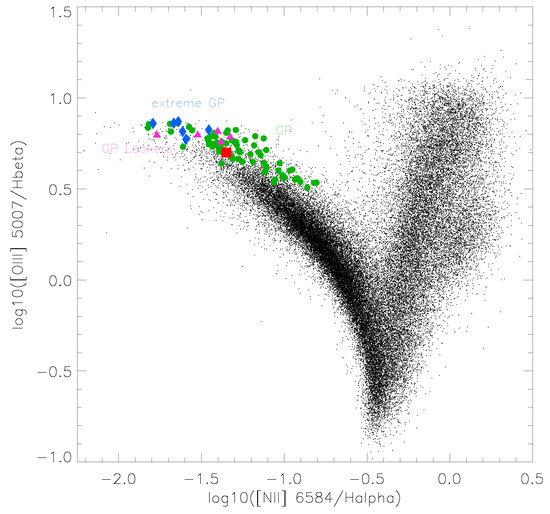 BPT diagram illustrating the similarity in integrated strengths between the Tarantula Nebula (red square), Green Pea (green circles), extreme Green Peas (blue diamonds), Lyman-continuum leaking Green Peak (pink triangles), updated from [108], plus SDSS star-forming galaxies.
