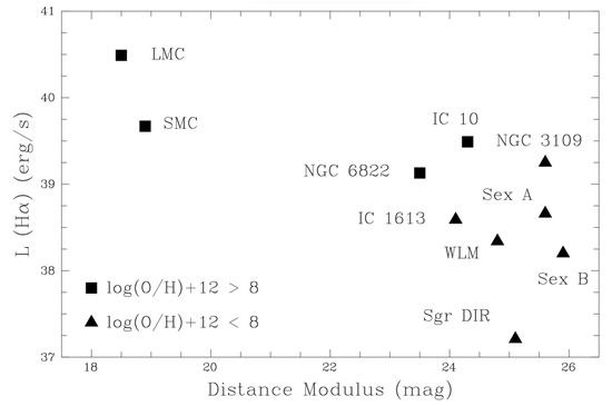 Comparison between present-day star formation rates, as measured by H luminosity [113], distance modulus (mag), and oxygen metal content (squares: ≥20% of solar value, triangles: <20% of solar value, for Local Group dwarf galaxies. Metal-poor galaxies possess low star-formation rates, so host small numbers of OB stars, and these are ≥6 magnitudes fainter than Magellanic Cloud counterparts.