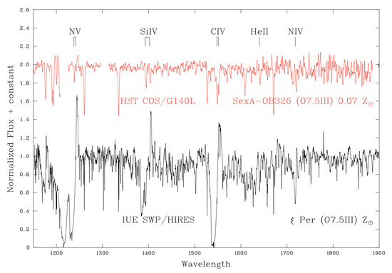 In order to test predictions of the metallicity dependence of massive star winds, it is necessary to measure mass-loss properties across a wide range of metallicities. Although theory has been qualitatively supported from the observed wind properties of Milky Way, LMC and SMC early-type stars [82], some issues remain, including weak winds in low luminosity OB stars. Our only opportunity to study individual massive stars below 1/10th of the solar oxygen content is to observe O stars in Sextans A and B with 7% solar [114] or the Sagittarius Dwarf Irregular Galaxy (SgrDIR) with 5% solar [115]. Stellar winds from early-type stars at such low metallicities are anticipated to be much weaker than in metal-rich populations, which has been confirmed by UV spectroscopy. By way of example, Figure 12 compares the far UV spectrum of Per (O7.5 iii) with a counterpart in Sextans A [116], revealing negligible wind signatures in the latter (e.g., C iv 1550).