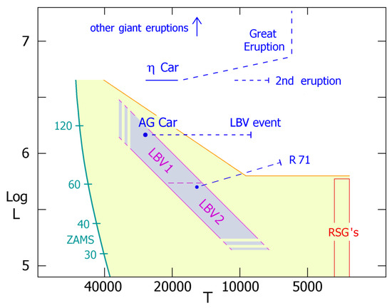 LBV’s are defined by a particular form of variability like AG Car in Figure 1 [1]. Their hot “quiescent” states are located along a strip in the H-R Diagram (HRD) shown in the figure, sometimes called the S Doradus instability strip [16]. Its upper and lower parts, LBV1 and LBV2, represent different stages of evolution—providing a clue for theory, Section 5.1 below.
