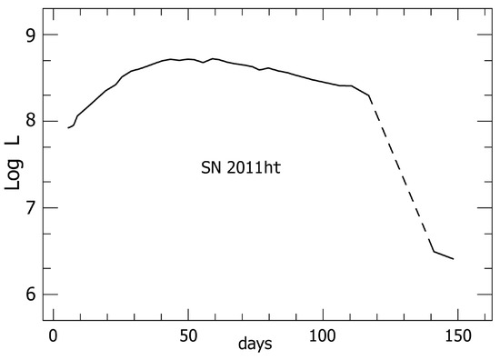 About two months after maximum, the visual-wavelength brightness abruptly decreased by a factor of 60 (Figure 2). Since normal dust formation does not account for this change [42], the simplest interpretation is that most of the trapped radiation escaped through the photosphere just before that time. A normal core-collapse supernova would have remained substantially brighter due to radioactive decays in the ejecta. Some authors assumed that 2011ht was a supernova in a discussion of the light curve [43]; but the lack of a radioactive afterglow was decidedly peculiar in that case, and the light curve was reasonable for a non-SN instability (Section 5 below). Spectroscopy gives far more definite information than the shape of a light curve, and strongly implied an opaque continuum-driven outflow far above the Eddington Limit [42,44,45].