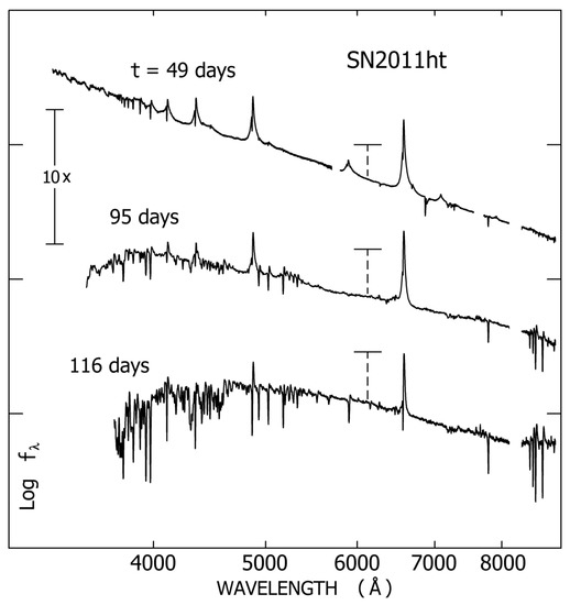Spectrum of SN2011ht at three different times [42], cf. Figure 2. Both scales are logarithmic, the three tracings have differing vertical offsets, and the marks near 6100 Å indicate erg cm s Å. Gaps at Å are obscured by terrestrial atmospheric features. Concerning the line profiles, see Section 4.2 and Figure 6.