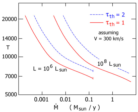 (This paragraph concerns technicalities that don’t affect the main concepts.) Each temperature in Figure 4 refers to a location in the flow, which does not represent any specific observable quantity. For comparison with observations, one would need to calculate emergent radiation in a manner resembling [71] and [73]; but a model with wavelength-dependent opacities would be much better. Figure 4 is based on many simplified models with constant luminosities L, mass-loss rates , and flow velocities V. It was assumed that , with LTE Rosseland mean opacities which are readily available (http://cdsweb.u-strasbg.fr/topbase/, [74], and refs. therein). Hydrogen and helium mass fractions were and . Integrating the spherical radiative transfer equations [73] with those opacities, we can calculate . One recent analysis [72] appears at first sight to favor lower temperatures than Figure 4, but the disagreements involve the distinction between and , and varying definitions of the observed T. Very likely the true ionization in the outer regions is larger than the LTE values; if so then the temperatures in Figure 4 are overestimates. Errors of that type are probably comparable to the differences between alternative definitions of T for the emergent radiation.