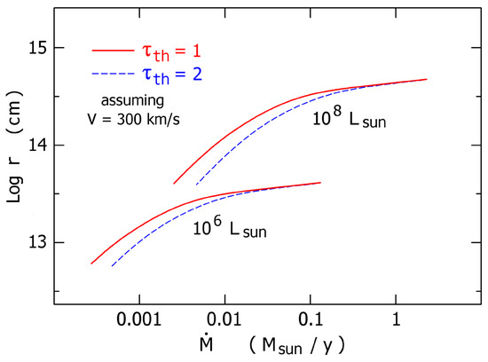 In a simple model where opacity depends only on and T, the temperature at a given location depends approximately on two quantities, and where V is the local outflow velocity [71,72]. Figure 4 shows examples of and in spherical outflows. Corresponding radii are shown in Figure 5. These sketches are intended only for conceptual purposes; they are based on simplified models that ignore some major details (see below).