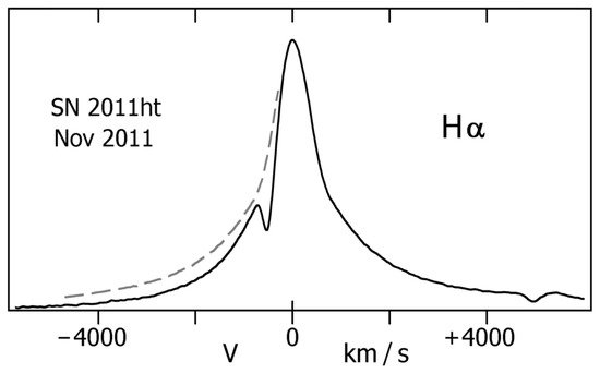 An excellent example is SN2011ht [41,42], whose brightness and timescale resembled a supernova (Figure 2). It may have been either a supernova impostor or else a true SN within a dense envelope of prior ejecta (Section 5.4 below); but in either case the observed display was a radiation-driven outflow. Its spectrum (Figure 3) had characteristics explained in Section 4 below, with outward speeds of several hundred km s and no hint of a blast wave before the brightness declined. Broad emission line wings were caused by Thomson scattering rather than bulk motion (Section 4.2), and the kinetic energy of visible ejecta was much smaller than in a normal SN [42].