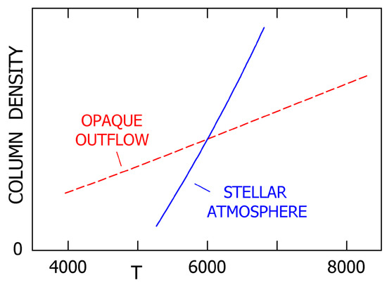 Sketch of the mass column density at temperatures below T, in a stellar atmosphere and in a dense outflow. These curves are based merely on idealized textbook-style models of and , but the difference between them is qualitatively valid.