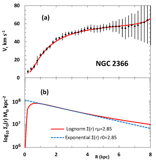 The ability of the LN model to generate realistic RCs with a good fit to observations is demonstrated for the dwarf galaxy NGC 2366 in Figure 1a, with M/kpc, , kpc, kpc. The high-resolution data were taken from the THINGSsurvey [42]. This survey enabled the effects of random non-circular motions due to collapsing gas clouds in star formation processes, bars, spiral density waves, and warps in the disc to be minimized with the construction of a “bulk” velocity field showing the underlying undisturbed rotation, as described by Oh et al. [42], with tracers such as and H defined to follow circular orbits. NGC 2366 has a relatively flat F-type curve, but shows a strong terminal rise beyond 7.5 kpc. This is a feature of many RCs with an abrupt termination [36], and the fitted LN curve fits the observations well, including the terminal rise.