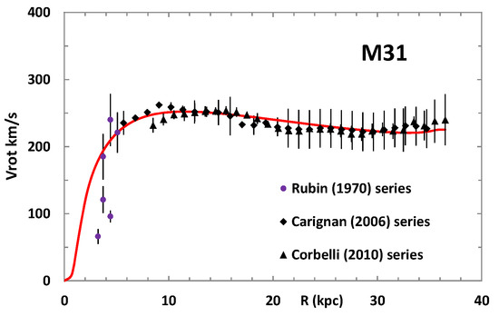 In contrast to an exponential distribution, these characteristics match the rotation curves for both dwarf galaxies such as NGC 2366 and large galaxies such as M31 (Figure 1a and Figure 2, respectively) and satisfy the observed disc density distributions for many spiral galaxies [35]. Stopping the surface density abruptly at produces a noticeable terminal rise in the RC [11], but although Equation (10) is exact only in the limit , in practice, as , the maximum radius for observations (kpc) beyond which gas and dust at the galactic periphery become undetectable. Although the terminal density may fall away more gradually, it is difficult to detect this termination observationally because any observable matter will already be included in the disc; matter beyond the detectable disc boundary will by definition be unobserved. Nevertheless, some observers have reported observations that showed no evidence of stopping at their limit of detection, and with the increasing sensitivity of observations, there is now evidence for some and molecular gas components extending beyond the original disc boundaries, usually described by adding further exponential components to the disc boundary as a biaxial or triaxial component to the disc [36,37].