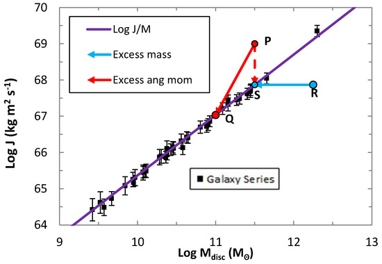 A log plot of J vs. M for the LN model, using the derived disc masses, is shown in Figure 3, with the r.m.s. best fitting slope of , which correlates well with the theoretical slope of [46]. It is, however, unlikely that the initial total induced angular momentum/unit mass of the proto-disc would have had this exact spin parameter, and two scenarios are shown: (a) excess M over J (Point R); and (b) excess J over M (Point P). To reach stability, each of these must move to the () line as suggested in Figure 3. In Case (a), it is possible that particles with low angular momentum will fall towards the centre of the proto-galaxy by a process of core-dumping; in effect, the proto-disc will lose mass to the bulge (Line R–S). In Case (b), it is unlikely that the proto-disc can lose pure angular momentum (Line P–S), but it may spin-off mass and angular momentum together to move to point Q on the () line, as shown (Line P–Q).