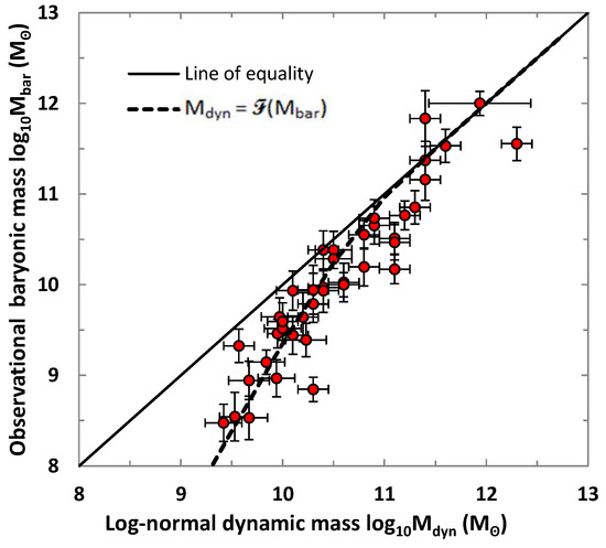 The total observational baryonic disc masses () calculated from for 41 galaxies widely spaced in mass and type are plotted against their corresponding LN dynamic masses () for comparison in Figure 4. The disc masses generated by the LN distribution demonstrated an inverse Mass Deficit Relation (MDR), with an increasing mass deficiency with decreasing disc mass. This confirmed a discrepancy that was described as the Mass Discrepancy Acceleration Relation (MDAR) by Janz et al. [67], and convincingly demonstrated by McGaugh et al. [68] who plotted 2693 points in terms of the local acceleration across the discs of 153 galaxies to show a strong Radial Acceleration Relation (RAR) with a one-fit parameter, the acceleration scale, m s [68], where the mass discrepancy became pronounced. The apparent increase in mass discrepancy with decreasing disc mass in Figure 4 may be correlated with the RAR by a corresponding mass scale, (Equation (13)):