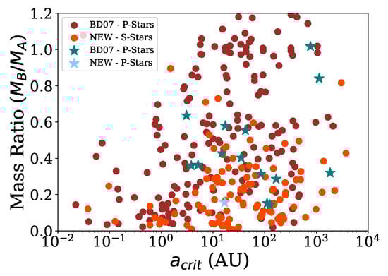 Critical semi-major axis vs. mass ratio () for the pairs in the Uniform Detectability (UD) sample with (stars) and without (filled circles) planetary companions. The new pairs not in BD07 are shown in light blue and orange, respectively.