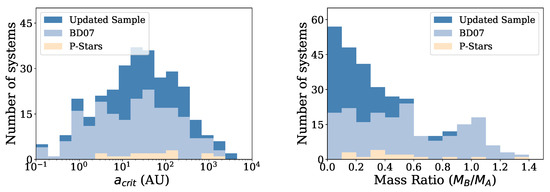 The full list of UD binaries as assembled above includes 313 of of the 850 stars in the sample. A total of 114 targets were added with respect to BD07 and three were removed (physical association rejected by Gaia, possibility of planetary companion explaining the astrometric signature). For all of the pairs, we derived the critical semi-major axis for dynamical stability (hereafter ; see [49] and BD07 for details). When available, we exploited the binary orbits. For the cases in which only the projected separation was available, we used the same approach as [58] and estimated a(au) as ()d(pc), thus assuming a flat eccentricity distribution (see Section 2.3 for details). In agreement with the assumption used for the semi-major axis calculation, an eccentricity value of 0.5 was adopted for the systems for which no information on the orbit was available5. The properties of all of the objects in the updated UD binary sample are listed in Table A1. Figure 2 shows the values of as a function of the mass ratio () for all pairs, highlighting the newly added objects.