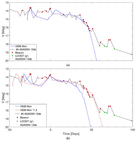(a) Comparing the V-band light curves of A13db1417 [47] and V838 Mon (Bond et al. [2], Starrfield et al. [39], Sparks et al. [63]). The magnitude scale is the apparent magnitude for A13db1417. The light curve of V838 Mon was shifted by mag to match the second peak before decline. The time axis focuses on the end of the duration of A13db1417 (see Sicilia Aguilar et al. [47]) which is the decline phase. The peak at 2,457,728 marks . (b) Same us the upper panel, but the light curves were shifted to match the peak just before decline. In addition, the time axis of the light curve V838 Mon is scaled by a factor of 1.3 relative to the matched peak. This results in that the two light curves match for about 4 mag.