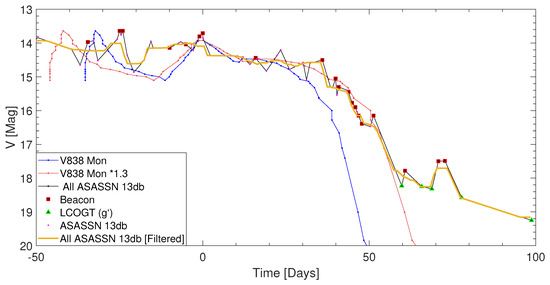 To apply this procedure we shifted down the much more luminous light curve of the 2002 outburst of V838 Mon [2,39,63] by mag, to have its peak at the same brightness as that of A13db1417. We then superimposed the light curve of the outburst of V838 Mon on A13db1417.