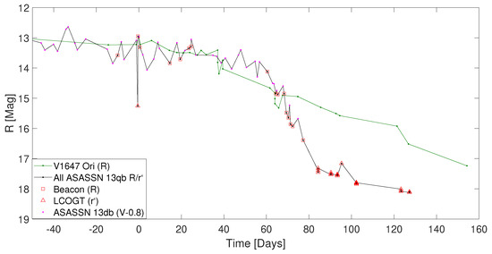 According to [47], the light curve of A13db1417 has an overall shape that strongly resembles in length, duration, and general shape (including the quick magnitude drop after a slow fading) the light curve of the FU Ori variable V1647 Ori that erupted in 2004 ([66] and references therein). The authors of [47] did not, however, present any comparison of these two light curves. Reference [66] do not bring V-band observations of V1647 Ori, but rather -band covering well the outburst and its decline. In Figure 3 we compare the R-band/-band light curve of A13db1417 with the -band of V1647 Ori. As there are no ASASSN R-band observations, but the observations from Beacon and LCOGT show thar and are almost constant, we adopt a constant shift of for the ASASSN observations, and use its V-band observations to obtain the R-band. We evaluate the error in this method is mag. Figure 3 shows that, though we try to make the two light curves match, the two objects have quite different decline slopes, with that of V1647 Ori being much steeper. The comparison to V838 Mon is by far superior. We consider it to be another hint that A13db1417 is not an FU Ori eruption.