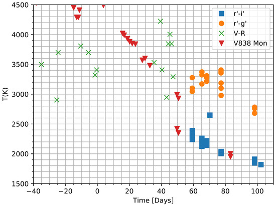 We calculate the temperature from the available observations, but the observations are quite noisy, and when calculating color the noise does not cancel. The results during the decline show that the effective temperature slowly declines with time during the 55 days of disk dissipation (Figure 4). The observations are insufficient for performing detailed comparison. However, we can compare them to the evolution of the effective temperature of V838 Mon (see Figure 2 in [67]). We can see that both objects had their effective temperature declining from to during the eruption, a similarity that adds to the similarity in the light curve we showed above.