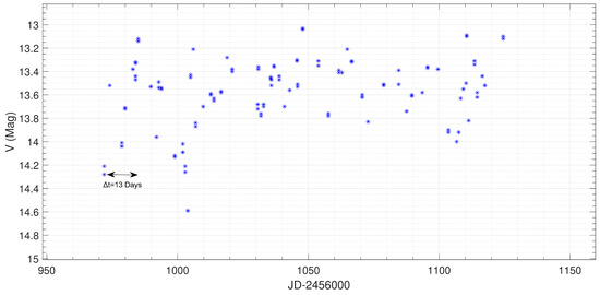 The 2013 outburst was not the last word heard from ASASSN-13db [47]. Later, in 2014, ASASSN-13db had another outburst of a different nature (not an FU Ori outburst), in which the peak magnitude in the V-band was brighter by about 1 mag than the outburst in 2013. The entire 2014–2017 transient lasted about 800 days. It stayed bright at a high plateau for about 500 days, experiencing fluctuations of mag. Later it started gradually declining for another , which ended in 2017 with a fast decline by approximately 2.5 magnitudes over two months (see Figure 1 of Sicilia Aguilar et al. [47]).