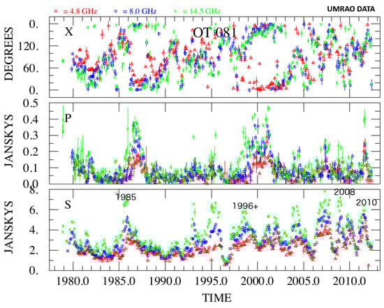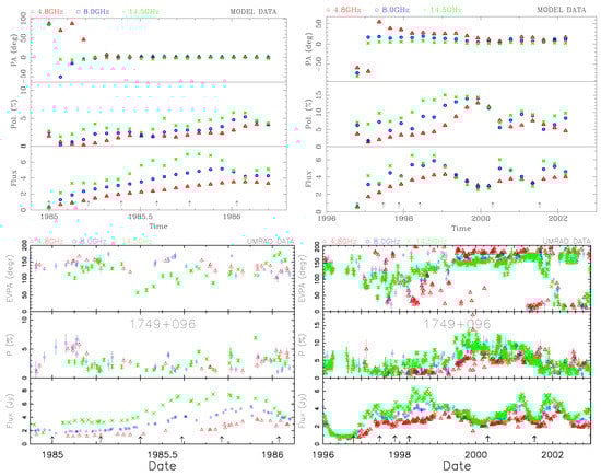 Longterm UMRAO light curves illustrate the range of variability in consecutive outbursts in the emission from the example program source OT 081 (1749 + 096). From bottom to top, 30-day averages of the total flux density (S), polarized flux (P), and electric vector position angle (EVPA or X) are shown. Green crosses, blue circles, and red triangles denote the data at 14.5, 8.0, and 4.8 GHz respectively. Modeled epochs are indicated with time labels in the lower panel.