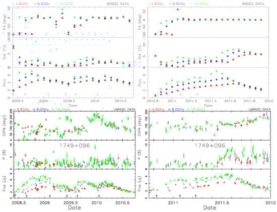 While in all other flares modeled the flow parameters were tightly constrained and well-determined, in this time period two acceptable fits were found because of a degeneracy between the Lorentz factor of the quiescent flow and the viewing angle, which resulted in very similar simulated light curves. We initially modeled T1996 with a Lorentz factor of 10 and a viewing angle of 1.1, and all other parameters as shown in Table 1, for this epoch. We subsequently obtained a marginally better simulation of the data features adopting a Lorentz factor of 5 and a viewing angle of 2.3, and these values are listed in Table 1 as the adopted model. While the simulated total flux density and fractional linear polarization light curves using the two models were both able to reproduce the general character of the light curves, the simulated EVPA light curves showed subtle differences, including a marginally-larger separation of the EVPAs with frequency and a better match to the detailed fine structure using the adopted model. Furthermore, the adopted model yielded a shock of 16.6c which is more in agreement with the maximum VLBA component speeds for the same epoch (e.g., is in the range 5-21c from 22 GHz data in [26] and = 6.85 ± 0.72c based on MOJAVE data during this time window [27]). The original model gave a substantially higher shock speed of 32.3c, which is inconsistent with these VLBA determinations, although it is possible that fast components were missed with the imaging observing cadence.