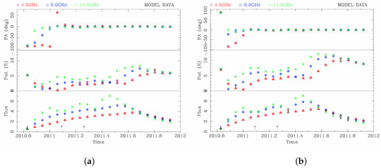 - Aller, M.F.; Hughes, P.A.; Aller, H.D.; Latimer, G.E.; Hovatta, T. Constraining the Physical Conditions in the Jets of γ-Ray Flaring Blazars Using Centimeter-band Polarimetry and Radiative Transfer Simulations. I. Data and Models for 0420-014, OJ 287, and 1156+295. Astrophys. J. 2014, 791, 53–66. [Google Scholar] [CrossRef]