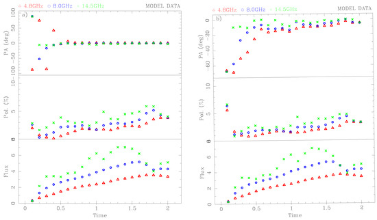 A general scenario for the production of outbursts in blazar jets based on a shock-in-jet model has been adopted by many researchers since the 1980s when it was proposed to explain the millimeter-to infrared variability observed during a major outburst in 3C 273 [15] and the multi-frequency, centimeter-band flux density and polarization variability observed in BL Lac as part of the UMRAO monitoring program [16,17], and we make the underlying assumption that the outbursts modeled are produced by the passage of one or more propagating shocks. The discrete emission features subsequently detected with very long baseline interferometry (VLBI) have also been associated with shocks; e.g., [18]. In our adopted scenario, a propagating shock compresses the initially-tangled magnetic field and any ordered components associated with the underlying flow. The signature of the shock event in the polarization data is a swing in the EVPA through tens of degrees, typically on a timescale of months, and an increase in the fractional linear polarization. For a transverse shock, this swing is through 90, while for oblique shocks it is through a smaller range. The shocks in the model are allowed to be oriented at a wide range of directions to the flow, but we have selectively picked epochs for modeling which exhibit swings through large ranges of EVPA, indicative of transverse shocks, as these are easiest to identify in the data. The orientation of the shock relative to the flow direction obtained from VLBI observations is specified by two angles [19]. These are the shock obliquity , the angle relative to the direction of the upstream flow, and , which specifies the azimuthal direction of the shock normal. However, the choice of the value for the azimuthal direction has been shown to have little effect on the simulated light curves [1]. In principle we should allow for the retarded time effect that results from a temporal change in physical parameters as a ray propagates along any line of sight. In the models presented in this paper the change occurs on a time scale quite long compared with the light travel time across the source; indeed, we examined the effect of including retarded time effects in [3] and demonstrated that it produces only a marginal change in the shape of the outburst profile. We do not include it in the analysis presented here because of the required additional computation time.