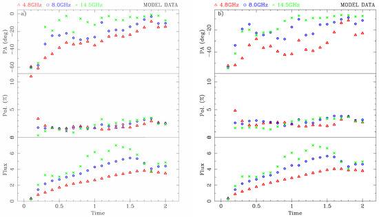 Simulated T1985 light curves with the addition of a weak helical magnetic field component. Panel (a) shows the simulated light curves for T1985 assuming a negligible helical magnetic field (an order multiple of 0.05; see text). As would be expected, this simulation is nearly identical to our adopted model (Table 1) which did not include a helical magnetic field. Panel (b) shows the simulated light curves for a helical field with strength approaching that of the random component (an order multiple of 0.5). Time is shown in arbitrary units.