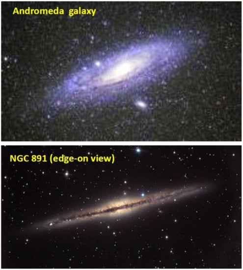 The computational results based on measured rotation curves for many galaxies of various types had shown more or less exponential decrease of (surface) mass density with galactocentric distance such as ρ(r) = ρ(0) exp(−r / Rd), i.e., the computed ρ verses r in a log-linear plots appear to be nearly straight lines with negative slopes, for the most part when the abruptly varying ends at r = 0 and 1 are trimmed out [18,19,20,21]. Hence, the “gravitational mass”—determined from rotation curves--distributions in disk galaxies qualitatively agree with the measured radial distributions of surface brightness for a large number of disk galaxies [24,25,26], but the disk radial scale length, Rd, determined from rotation curve based thin-disk model appears to be larger than that from fitting the brightness data (e.g., 4.5 kpc versus 2.5 kpc for Milky Way [20]). A straightforward interpretation of such a discrepancy would be an indication of increasing mass-to-light ratio with galactocentric distance, namely the (baryonic) matter becomes less luminous in regions further away from the galactic center. This is consistent with typical edge-on views of disk galaxies that often revealing a dark edge against a bright background central bulge (cf. the image of NGC 891 in Figure 1).