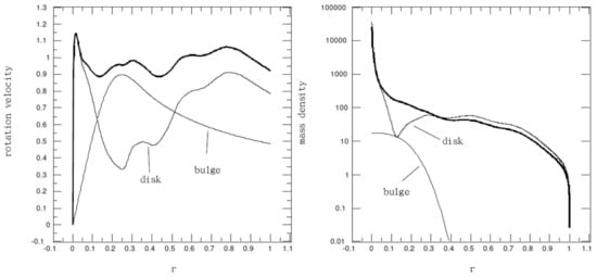 Profiles of the Milky Way rotation velocity V(r) and mass density ρ(r) for the disk portion and bulge portion as noted with the thick line as a reference from the pure disk model without a bulge (taken from Figure 7 of Ref. [21]). Noteworthy here is that the portion of mass density profile (shown with the thick line, as roughly a combined mass density profile from both disk and bulge) for r in the interval [0.1, 0.9] appears nearly linear in the semi-log plot (when when the abruptly varying ends around r = 0 and 1 are trimmed out), indicating an approximately exponential decline of mass density with galactocentric distance.