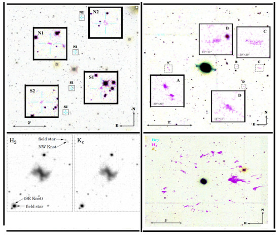 H continuum-subtracted NIRI images of K 4-47 (top-left panel, [16]), NGC 7662 (bottom-left panel, [16]), NGC 7009 (middle panel, [16]) and NGC 6543 (right panel [16]). The circles indicate LIS knots with H emission detected.