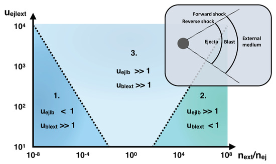 Figure 1. Phase diagram of relativistic ejecta ( | u ej | ext | 10 ) penetrating the external medium in the plane n ext / n ej , | u ej | ext | . The two dotted diagonals delimit the transition between the three typical regimes for the forward and reverse shocks in the blast wave frame: (1) a subrelativistic reverse shock and an ultrarelativistic forward shock; (2) an ultrarelativistic reverse shock and a subrelativistic forward shock; (3) relativistic reverse and forward shocks. The inset illustrates the general configuration for a relativistic jet.