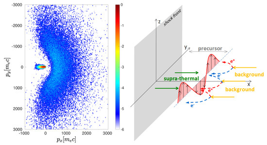 Figure 2. Left panel: Density distribution (in log 10 scale, as indicated by the color code) in momentum phase space, in the precursor of an unmagnetized relativistic shock with γ sh = 173 (i.e., γ u | d = 100 ), as measured in the downstream rest frame of a particle-in-cell (PIC) simulation, close to the shock front. The background plasma corresponds to the compact red (dense and cold) population, moving towards x . The suprathermal particle population, by contrast, appears as a relativistically hot and dilute cloud. Right panel: Mechanism of the current filamentation instability (CFI) induced by the mixing of the background and suprathermal plasmas. The pink harmonic perturbation represents a magnetic perturbation δ B z and the dashed lines indicate how the charged species are deflected, thus building up current filaments that amplify the magnetic perturbation. Adapted from [87,88].