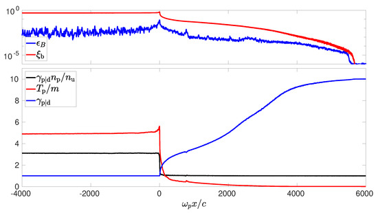 This is best illustrated by Figure 4, which presents a set of one-dimensional (transversely averaged) profiles along the direction of shock propagation, extracted at time t 10 4 ω p 1 from a 2D3V pair shock simulation with Lorentz factor γ sh = 17 (corresponding to relative Lorentz factor γ u | d = 10 ). The precursor region extends from x = 0 (the shock front location) to x 5 × 10 3 c / ω p . The background plasma (moving from right to left) is seen to heat up progressively as it decelerates through a microturbulence of growing amplitude, here quantified by the effective magnetization ϵ B = δ B | s 2 / 4 π γ sh 2 n u m c 2 .
