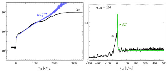 Let us note that for a simulation performed in the downstream rest frame, the apparent density of the upstream flow is equal to n u , app = n u γ u | d . This results in an apparent density of the downstream plasma equal to 4 n u , app in 3D simulations and to 3 n u , app in 2D PIC simulations (see, black line in Figure 4).