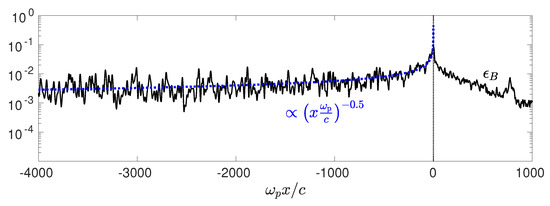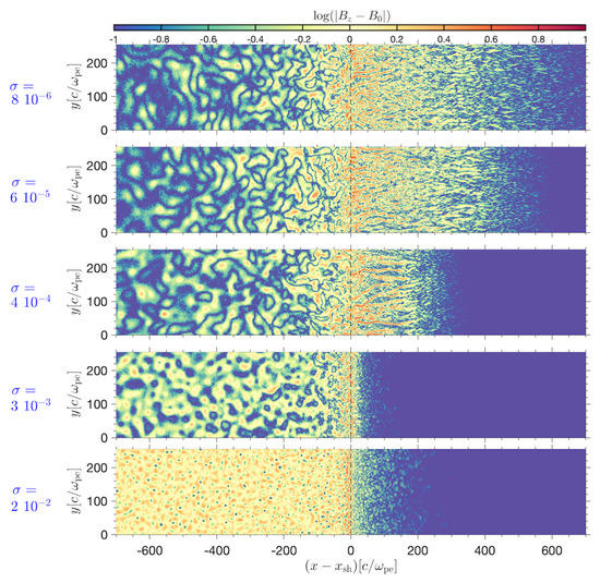 At sufficiently low magnetization levels, the background magnetic field does not affect the instability growth. In this section, we therefore consider an unmagnetized ambient plasma ( σ = 0 ). The dominant instabilities that arise when a hot dilute beam of particle penetrates a cold denser plasma are the current filamentation instability (CFI), the electrostatic two-stream and the so-called oblique modes [39,73,74,75,76,77,78]. In the relativistic regime of unmagnetized collisionless shocks, the CFI dominates over most of the precursor, and this is particularly true near the shock front, where the beam-to-plasma density ratio, n b / n p , approaches unity.
