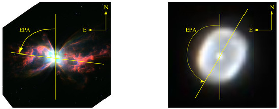 Typical examples of measuring the Equatorial Position Angle (EPA). Left: bipolar PN H 2-37 (HASH ID 93) and right elliptical PN M 1-11 (HASH ID 778), both from HST images. North is up and East is left. The EPA is the angle of the major axis measured from North towards the East.