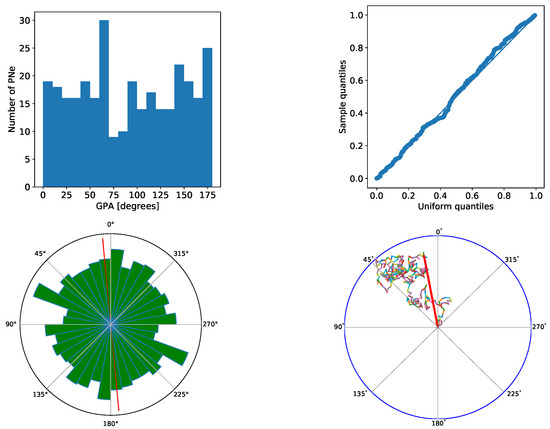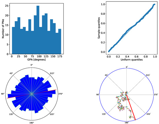 Histogram (top left), Uniformity plot (top right), Rose plot (bottom left), Vector plot (bottom right) of GPAs for all 293 elliptical PNe with a confidence flag of 1 and 2. Deviations from the diagonal in the Uniformity plot indicate non-uniformity. Only the left side of the Rose plot has been measured and then rotated by 180 degrees for better visibility. The mean GPA has been marked with a red line. Note that for the Vector plot the GPAs were doubled to get to the full circle.
