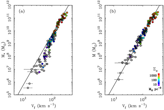 Tully–Fisher relations: the flat rotation speed as a function of (a) stellar mass, and (b) baryonic mass (). Gas masses follow from observed 21cm fluxes [60]. Stellar masses are estimated from observed luminosities and a population synthesis prescription for the stellar mass-to-light ratio: [48]. Here, and throughout the paper unless otherwise noted, we adopt for star forming disks and for bulge components in the band (often called [3.6]) of the Spitzer Space Telescope [47,61,62]. Rotation speeds are obtained from resolved rotation curves that are extended enough to measure [37,42,55]. Points are color coded by the effective stellar surface density when known from Spitzer data [29,49], ranging from low (blue) to high (red) surface brightness (scale inset). The gray points are gas dominated low surface brightness (LSB) galaxies that meet the quality criteria discussed by [55] but do not have Spitzer data. The line is the prediction of MOND [16] for the value of found by [33] before these data existed.