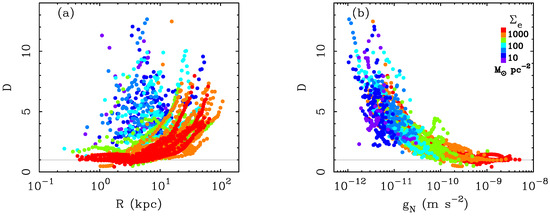 Indeed, the point of MOND is that the mass discrepancy is an acceleration-dependent phenomenon. Hence the amplitude of the discrepancy D should correlate with acceleration. This is apparent in Figure 2b, a purely empirical correlation that has been known for a long time [25,98,99] and which has become especially clear with the availability of near-IR data from Spitzer [34].