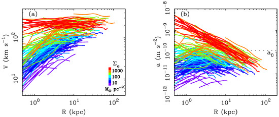 The (a) rotation curves of galaxies in the SPARC database [29] and (b) the corresponding centripetal acceleration curves . Each line is one galaxy; the MOND acceleration scale is noted in (b). Galaxies are color coded by the effective stellar surface densities, as in Figure 1 and Figure 2. High surface brightness spirals have rotation curves that rise sharply and flatten quickly. These are Freeman disks like those known at the time that MOND was developed. In contrast, LSB galaxies were essentially unknown at that time. They were subsequently observed [5] to have slowly rising rotation curves that only gradually turn over and approach the flat velocity, as predicted by MOND [16]. The direct connection between stellar surface density and dynamical acceleration predicted by MOND is illustrated by the rainbow variation in (b): low surface brightness galaxies have low accelerations (often well below ), while high surface brightness galaxies have high accelerations.