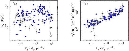 Conventionally, it had been expected that LSB galaxies should shift off of the Tully–Fisher relation defined by HSB galaxies [16,67], since the rotation speed depends on size as well as mass: . By squaring this, we obtain . It was argued [67] that a Tully–Fisher relation of the form follows if the surface brightness is the same for all galaxies, as was then believed [79]. This fails when confronted with data for LSB galaxies [76], which have different by definition.