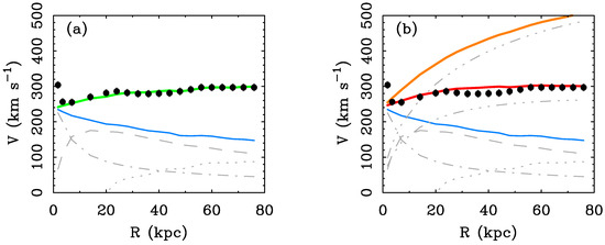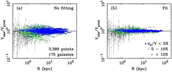The absence of the anticipated residuals poses a fine-tuning problem for conventional dynamics [4,80]. The observed flat rotation speed is the sum of a declining luminous contribution and increasing dark contribution: . Galaxies span a wide range of surface brightness at a given mass, but are indistinguishable to Tully–Fisher [4,5,28,81,82]. As surface brightness declines at fixed mass, declines with it, so must increase to precisely compensate and keep unchanged. The only way to avoid this fine-tuning is if all galaxies are dark matter dominated [80] so that at all relevant radii [80,83]. This limit requires implausibly low stellar masses [84], and is directly contradicted by the observed dependence of rotation curve shape on surface brightness [28,45,81,82,85,86,87,88].