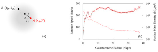 (a) Illustration of the centripetal component of the gravitational force vector. The gravitational force acting on mass at point A due to mass at point B is shown as the longer arrow. Its centripetal component is shown as the shorter arrow. (b) Illustration of Disk Mass Density Model (DM2) tracking the input rotation curve. The black solid curve is M31 galaxy rotation curve from Chemin et al., 2009 []. The red solid curve represents the surface mass density profile generated by DM2 based on the input rotation curve. Red crosses represent the reverse conversion of the computed density profile back into a rotation curve.