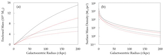 (a) Black dashed curve replicates Geehan 2006 [] “best-fitting model” dark halo mass for M31 galaxy, enclosed in a cylinder3 of radius r; red dashed curve is the corresponding DM2 disk mass fitting Geehan halo RC. The Black solid curve is Sofue 2015 [] dark halo model mass enclosed in a cylinder (<r); the red solid curve is the corresponding mass of DM2 disk. (b) The Black dashed curve is Geehan 2006 halo surface mass density; the red dashed curve is the corresponding DM2 disk density. The Black solid curve is Sofue 2015 halo surface mass density; the red solid curve is the corresponding DM2 disk density.