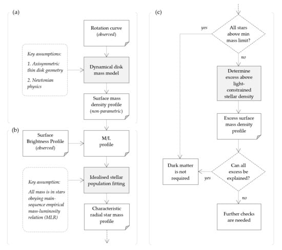 Here we summarize the logical sequence discussed above. We start with an observed galactic rotation curve which we convert into a radial density profile (using DM2 model based on two key assumptions: thin disk, Newtonian physics). We then divide each datapoint of the surface mass density profile by a corresponding datapoint of the observed surface brightness profile, to produce the radial M/L profile of the galaxy. Assuming that all galactic mass is in stars, we use empirical main-sequence stellar MLR to convert each datapoint of the radial M/L profile into a characteristic star mass, thus obtaining the radial distribution of characteristic star mass. If all datapoints of the characteristic star mass profile contain a physically plausible value (>0.075 M⊙), we conclude that no dark matter is required within the density/brightness observational radius. If some of the characteristic star masses fall below the minimum mass limit, we compute the corresponding value of excess density. If all excess density points can be explained with ordinary factors, we conclude that no dark matter is required within the density/brightness observational radius. To the extent there are excess density datapoints which cannot be fully explained with ordinary factors, we conclude that further checks are needed. Figure 3 recaps the key points of our analytical framework in a flowchart format.