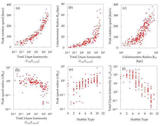 We assembled a dataset of 214 galaxies covering a broad range of sizes, heliocentric distances, morphologies, luminosities, and rotation velocities (see Appendix E). Figure 4 provides a snapshot of the sample along with correlations between these general properties. Consistent with other studies [,], our sample exhibits tight Tully–Fisher relation (correlation of peak rotational velocities with total galactic 3.6 μm luminosities is >0.86), as well as other well-known correlations.