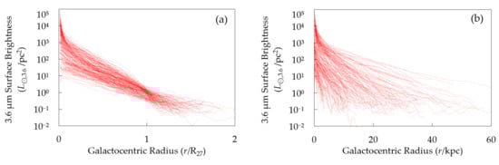 To make galaxies of a different size comparable, we express their radii in units that are multiples of R27—the radius at which 3.6 μm apparent surface brightness reaches 27 magAB/arcsec2. R27 marks the area within which Spitzer IRAC Channel 1 sensitivity stays relatively high, and is a useful common basis for comparing galaxies.