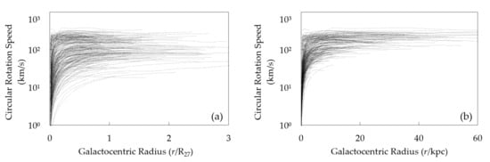 - Sofue, Y.; Rubin, V. Rotation curves of spiral galaxies. Annu. Rev. Astron. Astrophys. 2001, 39, 137–174. [Google Scholar] [CrossRef]